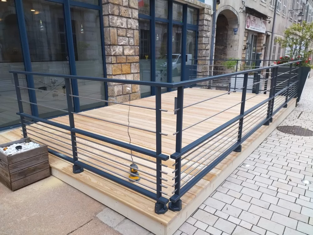 Votre menuisier à Poligny a posé une terrasse en mélèze avec une balustrade en aluminium pour un restaurant.